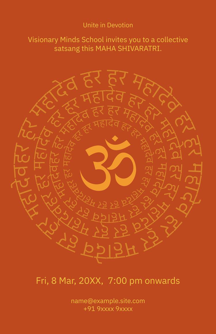If you are planning to observe an all-night vigil on Shivratri, use posters to help you focus throughout the night. To create a memorable poster, look through the template collection for one with an illustration of Lord Shiva or a background with the Trishula. Next, type in the mantra “Om Namah Shivaya”, a quote such as "Let us take inspiration from Lord Shiva to be always innocent and giving." or "Tonight is the time to experience the timeless and mystical beauty of the Lord Shiva and seek his blessings." Finally, download and print your poster so that you are well prepared for your prayers and puja.