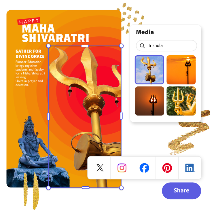 Adobe Express has an amazing range of free fonts and design elements, plus an extensive list of templates you can use to make posters with inspirational quotes for Maha Shivratri. Try pairing a flowing calligraphy-style font with "May the almighty Lord Shiva bless you and your family with prosperity. Happy Maha Shivratri." or one that conveys spirituality with "This Maha Shivratri, let us spend the night worshipping Mahadev and chanting his name to seek his blessings." Whatever aesthetic you prefer, you'll soon see it's quick and easy to make a poster with the fabulous fonts and free design tools in Adobe Express.