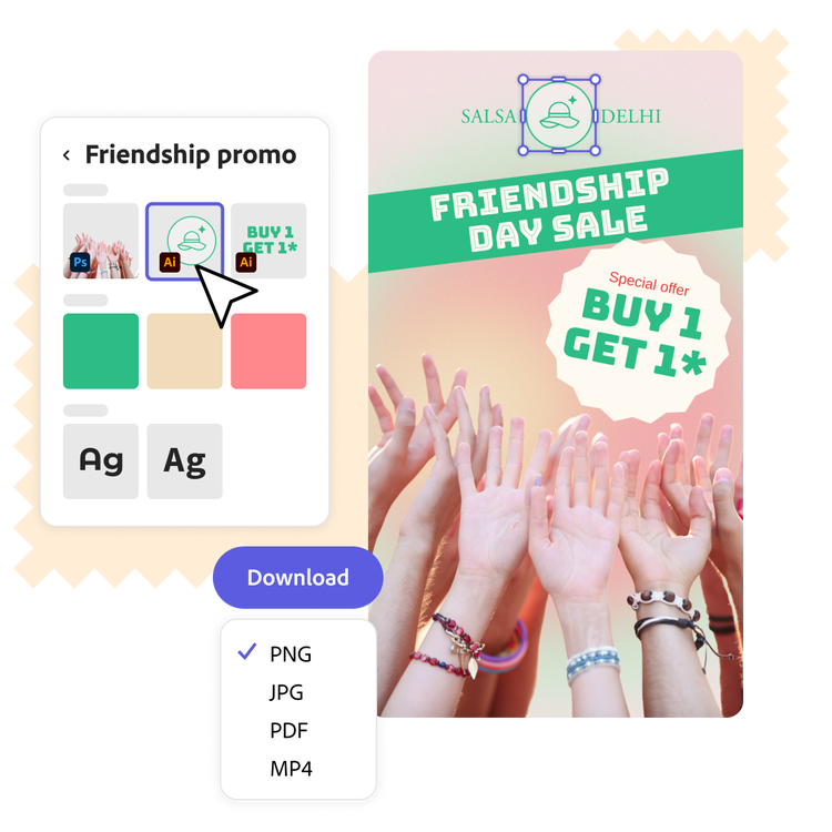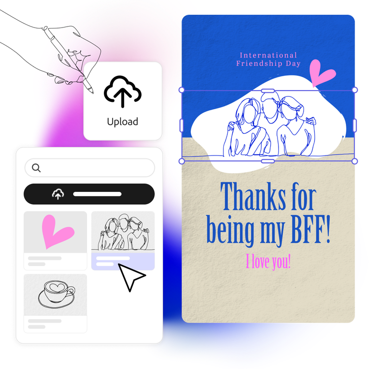 Plan your Instagram stories for Friendship Day in advance or create something last-minute by using an existing Friendship Day template. Add quotes that speak about true friendship and how they make our lives richer. Choose from gorgeous fonts for your text in the Adobe Express library or, add illustrations that show friends having fun together. You can make your stories a series by duplicating the post and adding different text or images on each story design. It’s easy to create engaging stories for Friendship Day using Adobe Express.