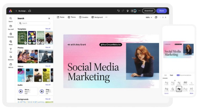 Wrap up your video with a royalty-free soundtrack from Adobe Stock. Choose any element in your marketing video to animate or apply one-click filter effects to enhance the look and feel of your project. Lastly, deliver an on-brand message when you add your brand colors, preset fonts, and logo across all your video projects.Resize, download, & share online.