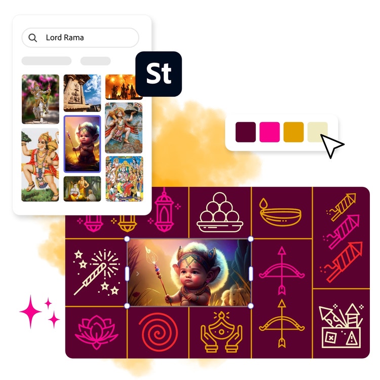 Don't be tempted to use generic wallpapers for this festival holiday. It's easy to create awesome wallpapers in minutes with Adobe Express – and it's completely free to use. Lord Rama with his bow and arrow is the perfect inspiration for this celebration so start by searching for his photo in Adobe Express and take it from there.