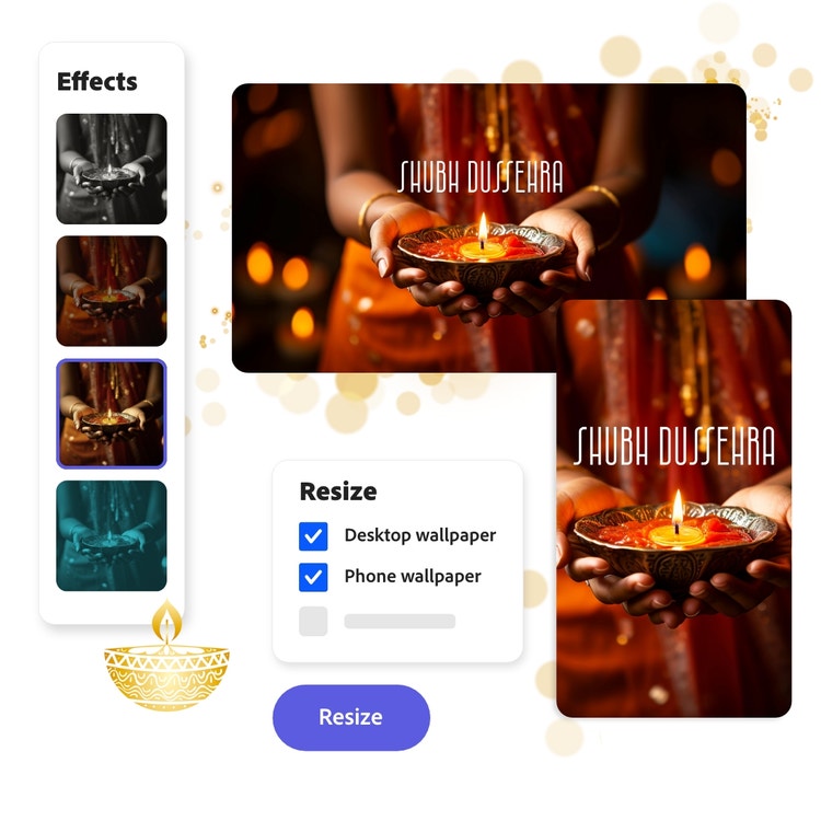 In simple terms, Dussehra signifies the victory over evil, and there are many ways to celebrate that. Whether you are inspired by the triumph of Goddess Durga over the demon Mahishasura, or Lord Rama's epic battle with Ravana, Adobe Express can help you express ideas and share the joyous festivities through digital wallpapers for all your devices.