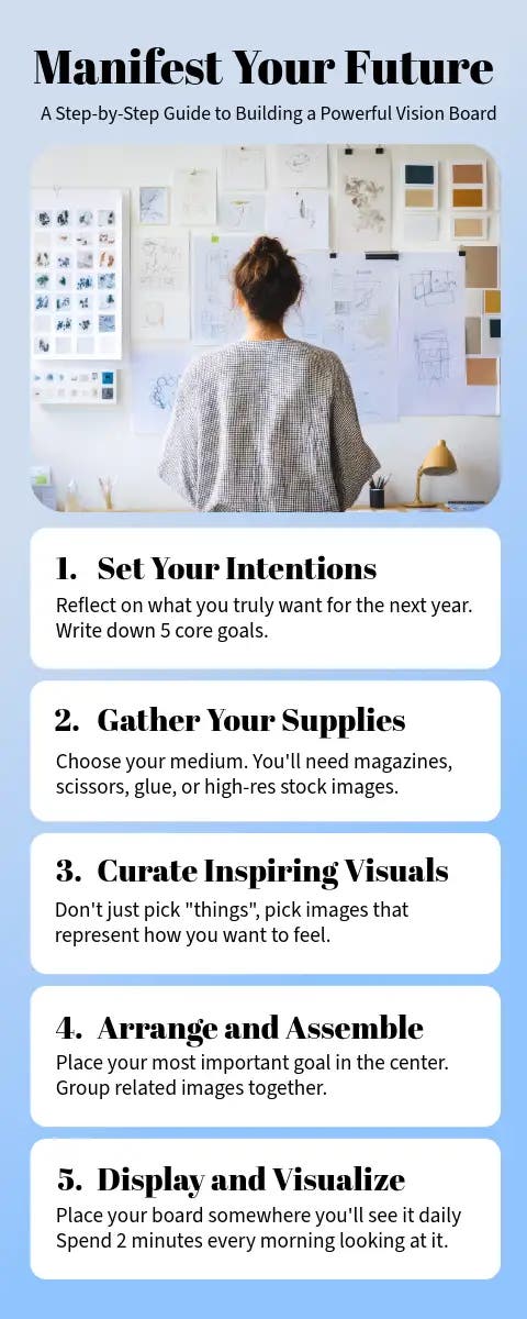 - Go public with your vision board. When you've spent time creating a fabulous vision board, it makes sense to use the content again. Use images from your vision board in social media posts. Create a series of posts as "My vision board ideas" and schedule them in Adobe Express to help share your vision with your followers.