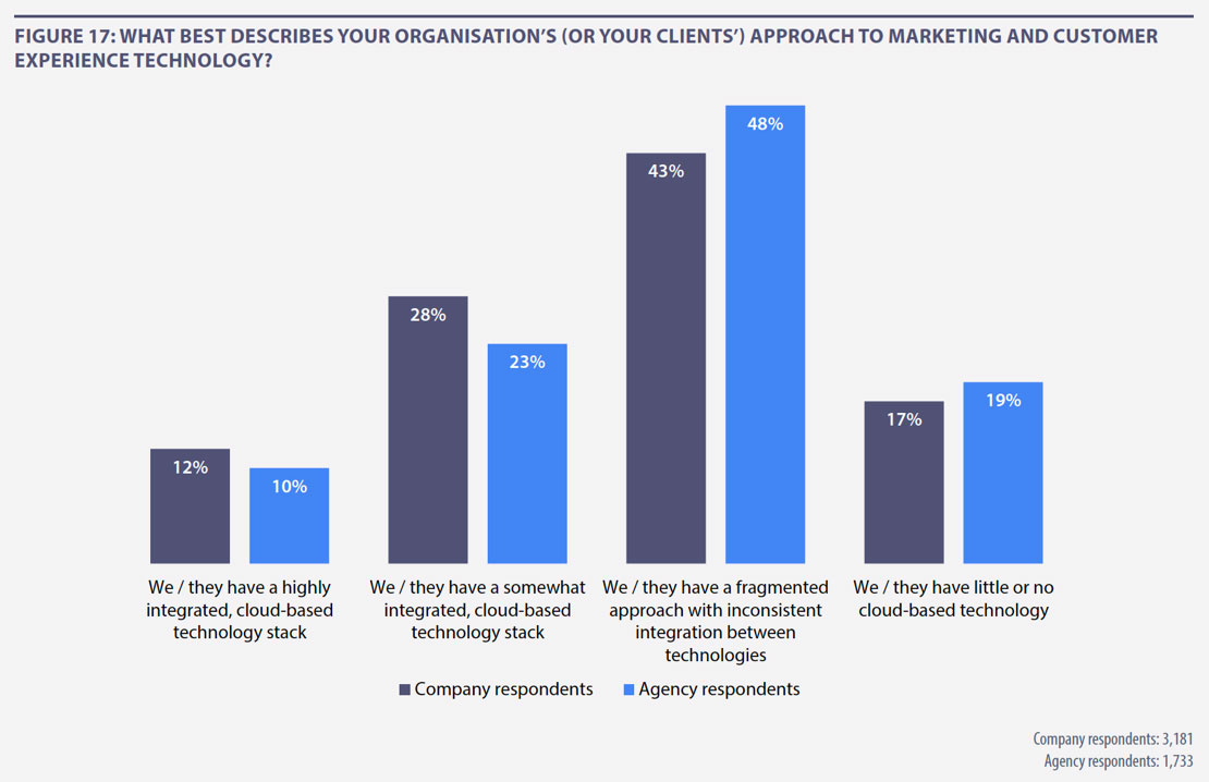 Organisations are most likely to have a fragmented approach with inconsistent integration between technologies, an unsatisfactory state of affairs indicated by 43% of company and 48% of agency respondents. A lack of integration reduces the chances of providing a seamless customer experience. It can also be frustrating for marketers and other employees who want to go about their jobs without unnecessary restrictions in their ability to acquire, retain and delight customers.