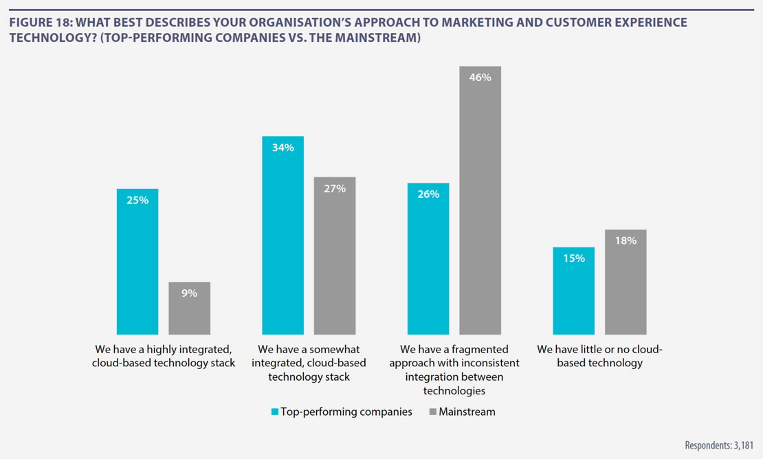 Our research shows that a highly-integrated, cloud-based tech stack for marketing and customer experience requirements is very much possible, with 12% of respondents claiming to have this in place. It is also very much worth the effort. As can be seen in Figure 18, top-performing companies are almost three times more likely than their mainstream peers to have this kind of infrastructure in place (25% vs. 9%).