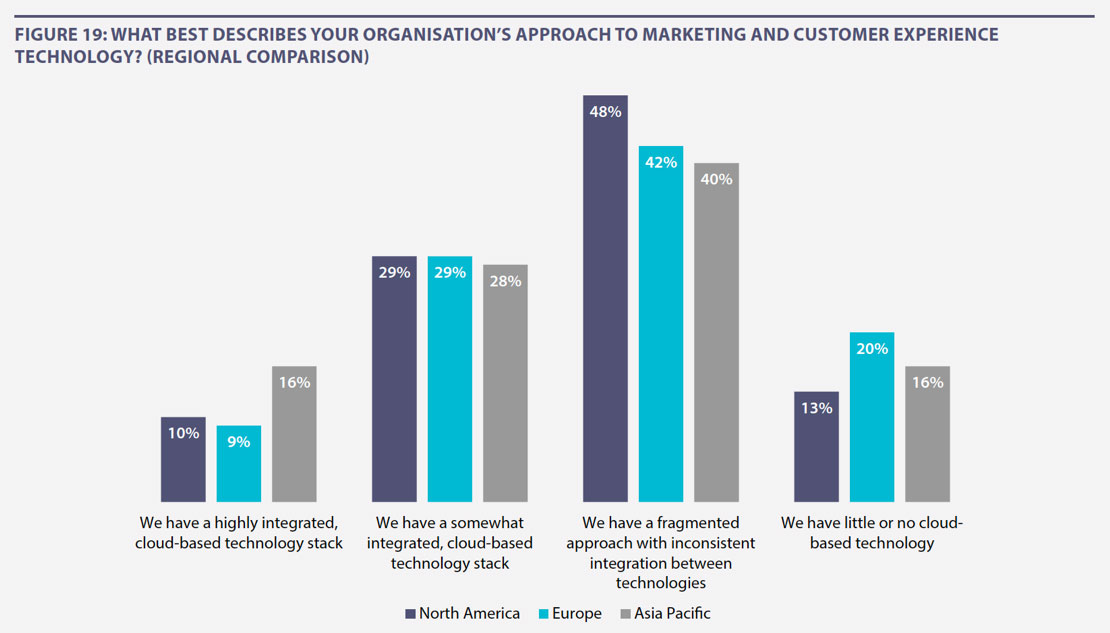 Figure 19 shows how organisations in different regions approach their technology. APAC respondents are more likely to have an integrated, cloud-based technology stack, with 16% of research participants in this region saying their companies have this in place, compared to 10% in North America and 9% in Europe.