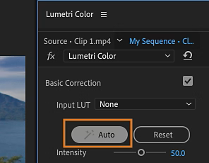 - In the Basic Corrections section at the top of the Lumetri panel, click the Auto button. The tool will instantly adjust exposure, contrast, highlights, shadows, whites, and blacks.