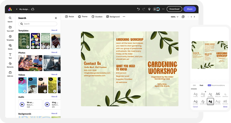 Enjoy the freedom of creating a professional-quality brochure without the hassle of adjusting your page layout or having to start your own from scratch. Create, edit, and add charts and visuals anywhere in your brochure design, blending visual elements alongside your text to further convey your message. With Adobe Express, it's free and easy to make, save, and share standout brochures.
