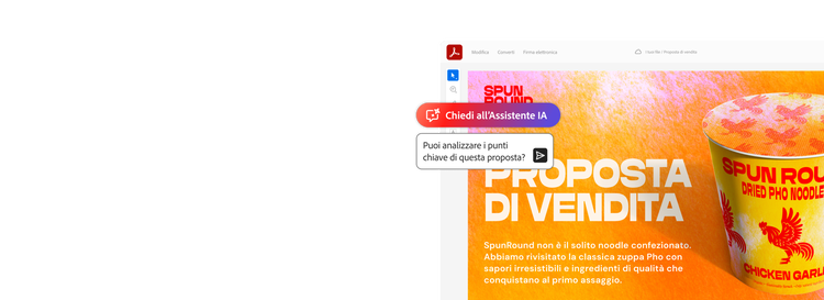 Abbonati subito e risparmia il {{percentage-discount-acrobat-pro}} su Acrobat Pro per i primi 6 mesi. Il prezzo totale per Acrobat Pro e l'Assistente IA è di PRICE - ABM - Adobe Acrobat Pro and AI Assistant {{small-tax-incl-label}} per i primi 6 mesi e in seguito di PRICE - ABM - Adobe Acrobat Pro and AI Assistant {{small-tax-incl-label}}, mentre il prezzo del solo Assistente IA è di PRICE - ABM - AI Assistant {{small-tax-incl-label}}. Piano annuale con fatturazione mensile. Solo per chi si abbona per la prima volta. Vedi condizioni. Sono disponibili anche piani mensili.