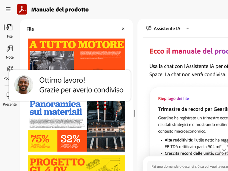 Diminuisci il tempo che passi sui documenti del 75% in media con l’Assistente IA di Acrobat.