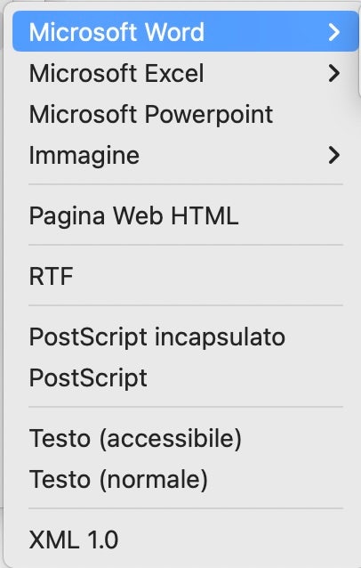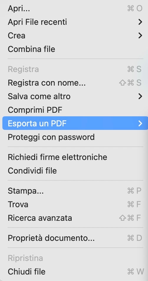 - Nel menu File, fai clic su Esporta un PDF e scegli un formato compatibile con il software OpenOffice desiderato (seleziona Word per Writer o Excel per Calc).