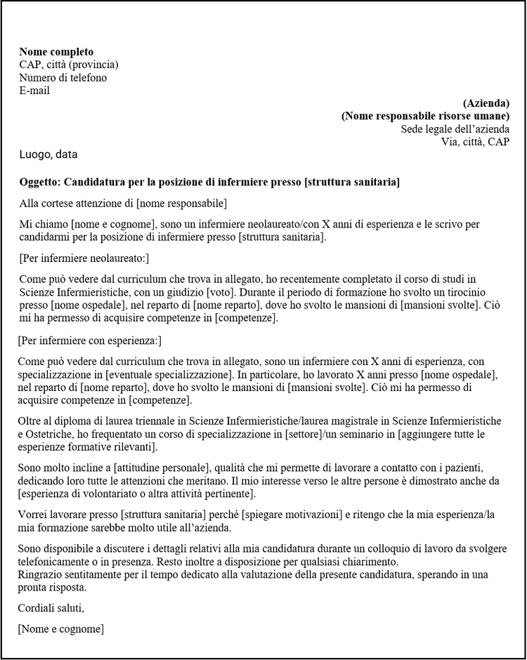 - Corpo del testo. Ti consigliamo di scrivere 4-5 paragrafi in tutto. Comincia con una breve presentazione, specificando il tuo profilo professionale e il ruolo per cui ti candidi. Prosegui con un paragrafo dedicato alla tua esperienza pregressa, maturata durante gli anni di lavoro o il tirocinio universitario (per maggiori dettagli, ti rimandiamo alla sezione successiva di questo articolo) e con la descrizione del tuo percorso formativo. Infine, spiega perché stai inviando la tua candidatura a quella specifica struttura sanitaria e indica le ragioni per cui ritieni di essere la persona più adatta per ricoprire quel posto vacante da infermiere.