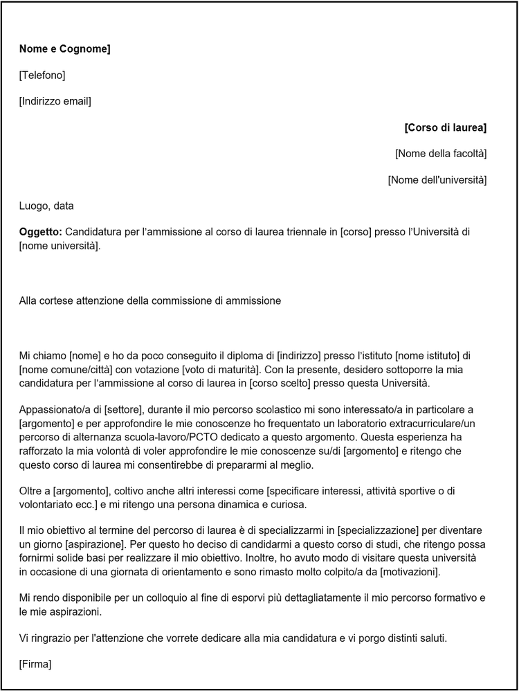 Prima di entrare nel vivo, dovrai anche indicare l'oggetto della lettera di presentazione per l’università, per precisare che stai inviando una candidatura. Indica il nome del corso di studi seguito dal nome dell’università. Ad esempio “Candidatura per l’ammissione al corso di laurea in Economia presso l’Università Bocconi di Milano”.
