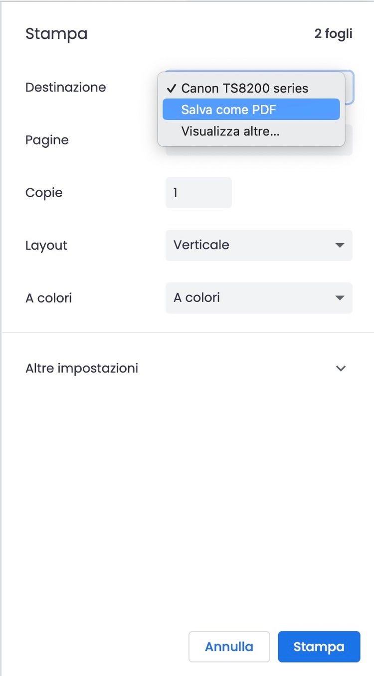 - Verrà visualizzato il Menu di stampa. Nel menu a discesa Destinazione, dove è indicato il nome della stampante, fai clic con il tasto sinistro del mouse e seleziona l’opzione Salva come PDF.