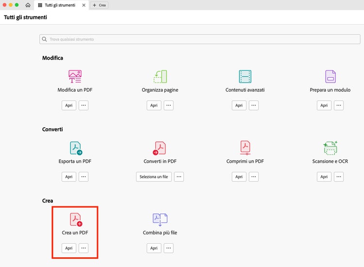 Se hai installato Adobe Acrobat, apri l’applicazione e seleziona Strumenti > Crea un PDF.