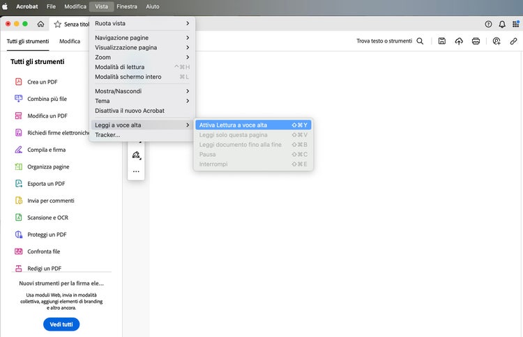 - Attiva la sintesi vocale. Vai su Visualizza > Leggi a voce alta e seleziona Attiva lettura a voce alta per avviare la sintesi vocale del file PDF.