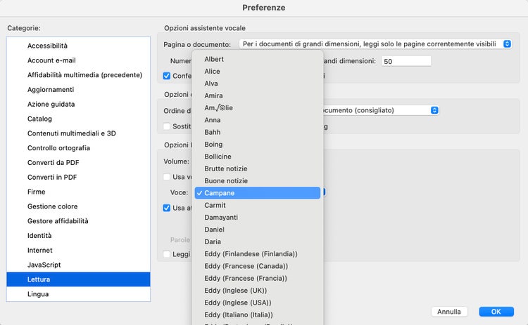 Puoi scegliere diverse opzioni per personalizzare la sintesi vocale di un file PDF.