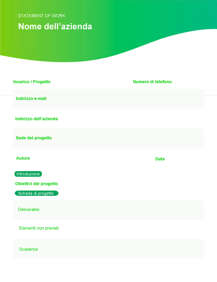 Lo statement of work, invece, è un piano completo che contiene i prodotti da consegnare, i requisiti, le tempistiche e gli obiettivi: in sostanza, fornisce una descrizione dettagliata del progetto.