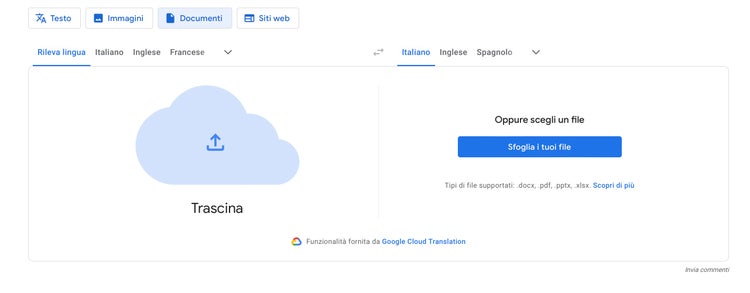 Il software di traduzione automatica Google Traduttore consente di tradurre in maniera approssimativa un testo copiato e incollato o di tradurre un intero documento in formato PDF. Per un file PDF, accedi all’interfaccia tramite l’URL https://translate.google.com/, quindi fai clic sulla scheda Documenti > Sfoglia i tuoi file > Traduci.