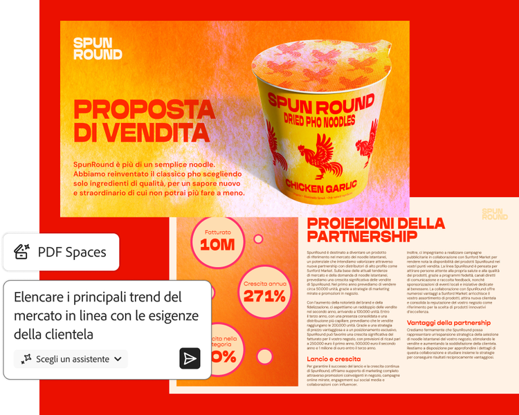 Con Acrobat Studio o l'add-on Assistente IA per Acrobat, puoi scoprire dati strategici in PDF, file Microsoft 365 e link web. Verifica le risposte con citazioni precise. Riassumi documenti e fai domande con PDF Spaces e un Assistente IA preconfigurato.