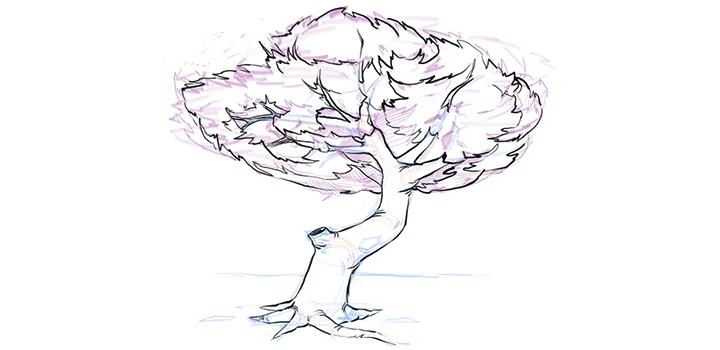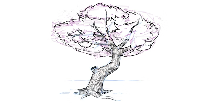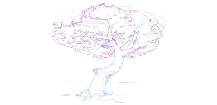 Parti da una serie di linee principali per delineare la forma generale e scegliere la direzione in cui andranno i rami. Per questo albero, Nugent ha scelto di iniziare con lo stile di disegno a matita in grafite su Adobe Fresco. Anche penna e inchiostro funzionano bene con questo metodo, tenendo da parte acquerelli o matite colorate per un secondo momento.