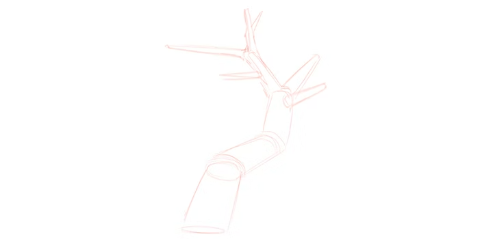 Gli alberi hanno forme cilindriche, se si scompongono nella loro struttura più essenziale. Disegna forme cilindriche sopra le linee strutturali appena abbozzate per costituire le radici, il tronco e i rami principali, conferendo maggiore tridimensionalità. “È sempre utile osservare alberi veri per comprendere la struttura dei rami”, afferma Nugent. “Normalmente, il tronco dell’albero è più grosso e va assottigliandosi fino a trasformarsi nei rami”.