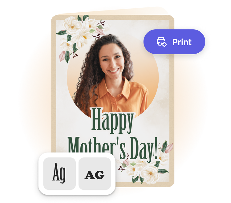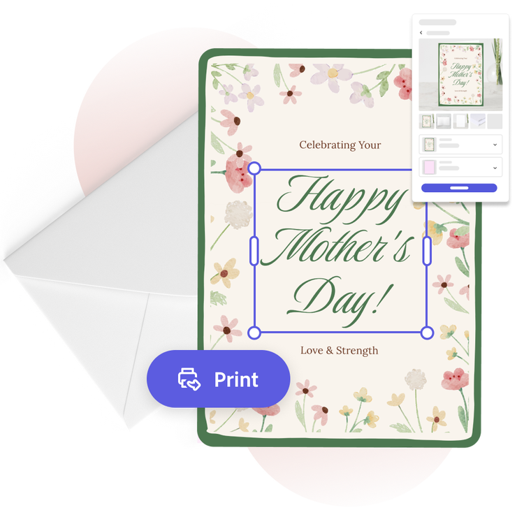 Con il creatore di biglietti per la Festa della Mamma puoi dimostrare alla mamma quanto sei diventato responsabile inviandole un biglietto stampato. Il creatore del biglietto ti guiderà attraverso i passaggi della progettazione, dalla scelta del modello alla personalizzazione con immagini e il tuo messaggio. Una volta terminato il design, puoi ordinare una stampa professionale di alta qualità direttamente da Adobe Express (disponibile solo per gli utenti desktop di Stati Uniti, Regno Unito, Australia o Canada), tutto tramite l'app all-in-one per creare tutto ciò che vuoi.