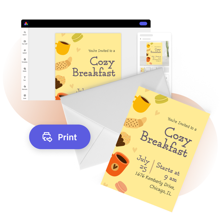 Con il creatore di inviti per colazione puoi passare facilmente dalla progettazione alla stampa. Che tu sia un organizzatore di eventi esperto o alle prime armi, il tuo invito non dovrà finire nella posta indesiderata. Una volta che il tuo progetto è pronto, puoi scaricarlo per stamparlo dal tuo computer oppure ordinarne le stampe dall'app Adobe Express e fartele consegnare a casa (disponibile solo per utenti desktop di Stati Uniti, Regno Unito, Australia o Canada). Non resta che aggiungere l'indirizzo e il francobollo alle buste.