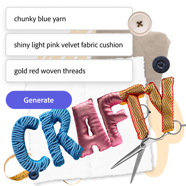 Aggiungi il tocco finale al tuo collage di foto di famiglia personalizzato con Effetti di testo. Apri il tuo collage nell'editor di Adobe Express e trasforma qualsiasi titolo o testo in una composizione tipografica tattile o tridimensionale per renderlo ancora più accattivante. Per un effetto più festoso, puoi usare fili blu o dorati intrecciati per il tuo messaggio. Basta digitare in un semplice prompt e guardare Adobe trasformare il testo di base e gli stili dei font in qualcosa che risalti nel tuo collage di famiglia.