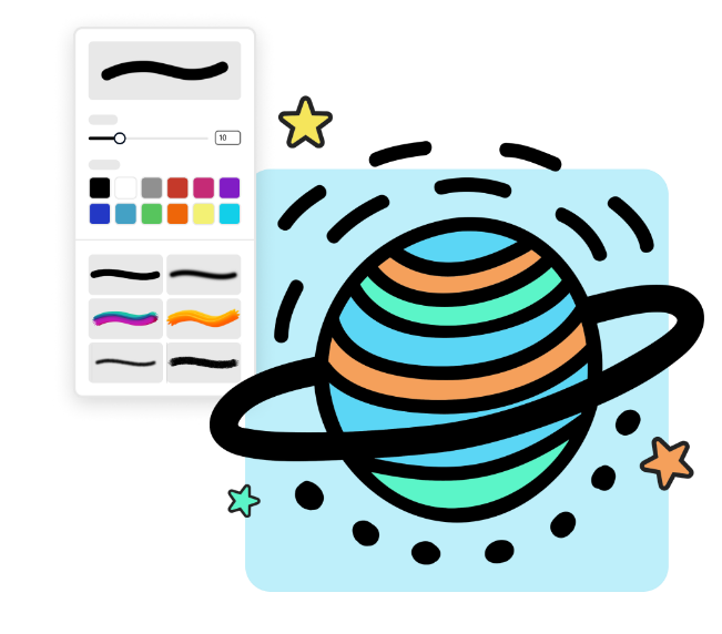 Scegli tra una varietà di pennelli, pennarelli, texture, colori e molto altro ancora per iniziare a disegnare su una tela bianca. In alternativa, carica le tue immagini o scegli un modello da disegnare o colorare.
