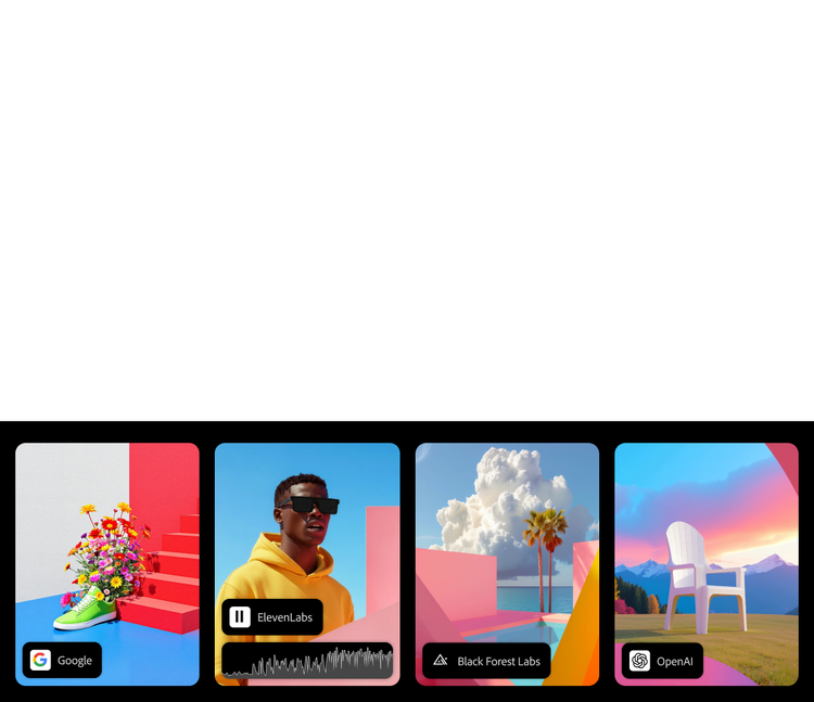 Genera i tuoi contenuti a partire da modelli di IA eccellenti realizzati da Adobe, Google, OpenAI, ElevenLabs e altri partner.