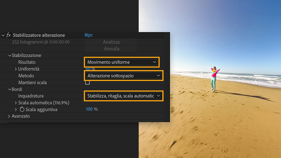 Nella maggior parte dei casi, lo strumento Stabilizzatore alterazione dà buoni risultati. Tuttavia, se desideri perfezionare l'effetto finale, ad esempio intervenendo sul ridimensionamento e sul ritaglio, puoi modificare le impostazioni nel pannello Controlli effetto (Finestra > Controllo effetti).