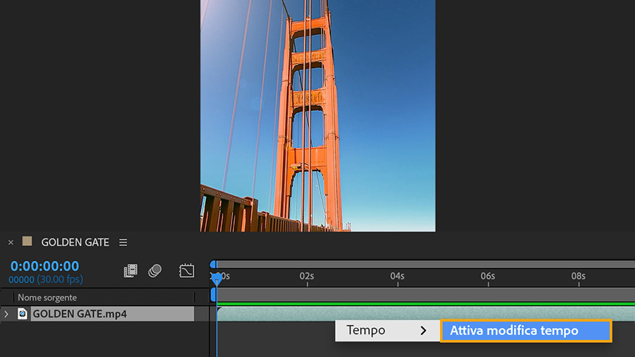 Fai clic con il pulsante destro del mouse su una clip nella timeline e scegli Tempo > Attiva modifica tempo per applicare una rampa di velocità e alternare un movimento lento a uno veloce, aggiungendo intensità alla scena.