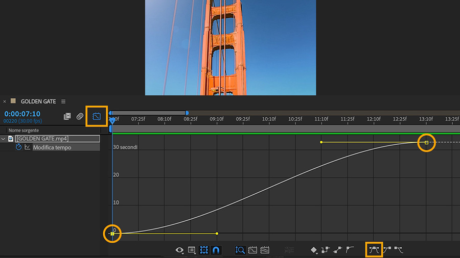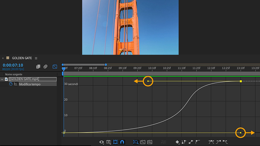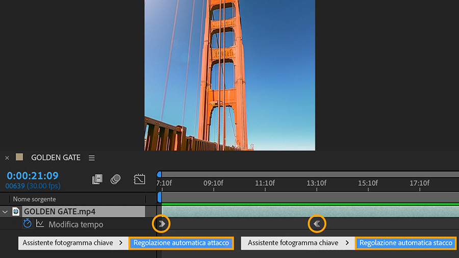 Trascina i fotogrammi chiave sulla timeline per definire l'inizio e la fine della rampa di velocità. Quindi fai clic con il pulsante destro del mouse su ciascun fotogramma chiave e scegli Assistente fotogramma chiave per selezionare le opzioni di andamento che permettono di controllare la transizione del movimento tra due velocità.