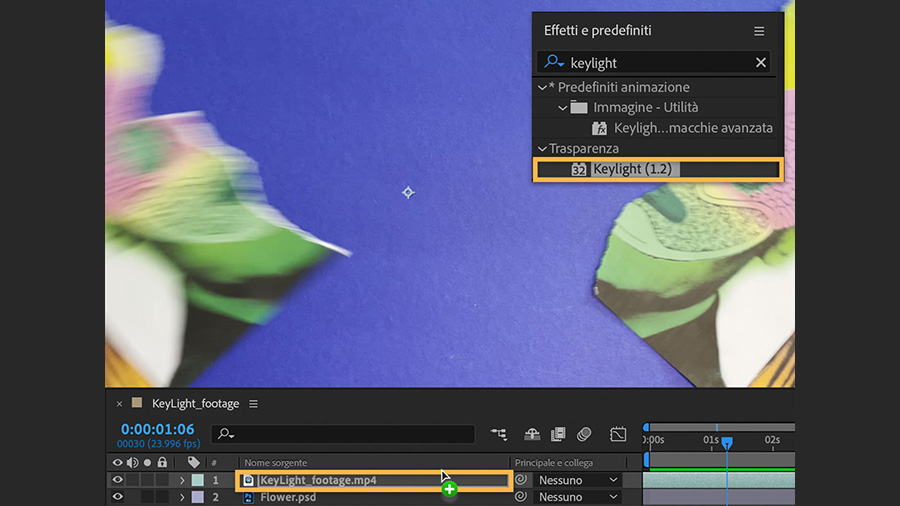 Sposta la testina di riproduzione sulla timeline finché la carta non si strappa e si vede lo sfondo blu. A questo punto, cerca “keylight” nel pannello Effetti e predefiniti (Finestra > Effetti e predefiniti) e trascina l’effetto Keylight (1.2) sul livello del video.