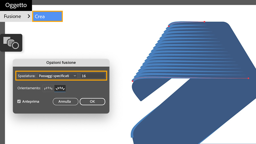Scegli Oggetto > Fusione > Crea per creare il motivo. Quindi fai doppio clic sullo strumento Fusione per impostare le opzioni in modo che corrispondano a quelle mostrate nell'immagine.