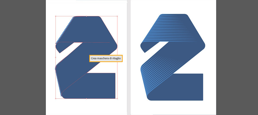 Includi i motivi all'interno della forma. A tale scopo, fai clic per selezionare la forma blu con lo strumento Selezione, premi Ctrl+C (Windows) o Comando+C (macOS) per copiarla e incollarla nella stessa posizione (Maiusc+Ctrl/Comando+V). Quindi trascina con lo strumento Selezione per selezionare la forma e i motivi a linee, fai clic con il pulsante destro del mouse e scegli Crea maschera di ritaglio.