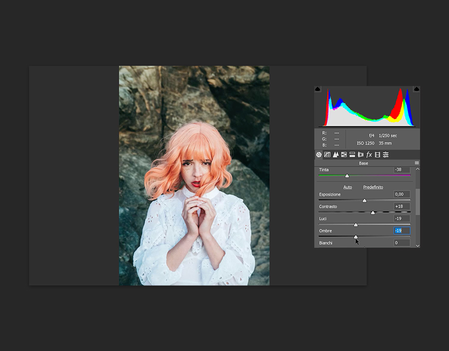 Come prima cosa seleziona lo strumento Bilanciamento del bianco. Esegui lo zoom in avanti usando Comando/Control e +, poi fai clic sul punto bianco più neutro della foto. Se il tuo soggetto è una persona, il bianco della sclera dell’occhio è perfetto. Con un solo clic potrai regolare i livelli. Ora hai a disposizione un’ottima tela su cui lavorare.