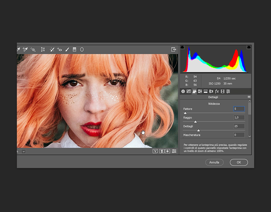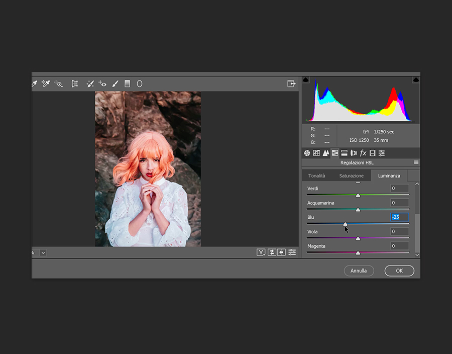L’ultimo passaggio prima di uscire dal filtro Camera Raw: seleziona l’icona Regolazioni HSL. Questa funzione ti consente di controllare Saturazione, Tonalità e Luminanza dei colori. In che modo intervenire per modificarli è una tua scelta, quindi sperimenta quanto vuoi. Ogni regolazione avrà un impatto su un’area diversa della foto. Fai clic su OK quando il risultato ti soddisfa.