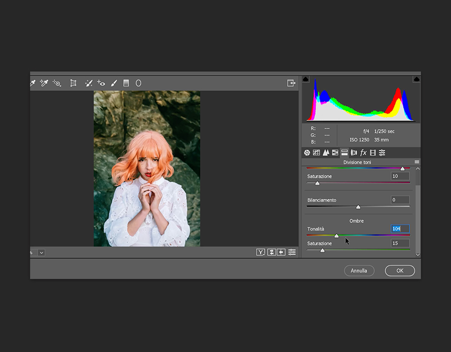 Ora è giunto il momento di sperimentare con i colori. Seleziona l’icona Divisione toni che ti consentirà di regolare la tonalità di luci e ombre. Innanzitutto dovrai aumentare la saturazione prima di poter cambiare la tonalità.