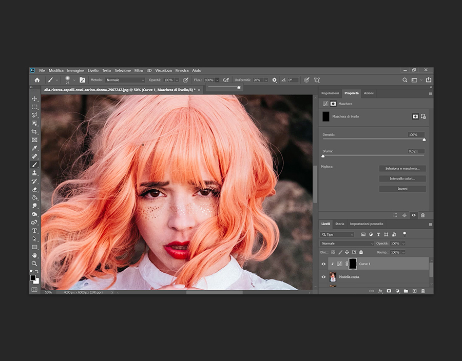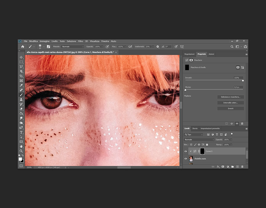 Nella barra degli strumenti a sinistra, seleziona il Pennello morbido e verifica che i valori di Opacità e Flusso siano impostati su “100”%. Esegui lo zoom in avanti sugli occhi del soggetto e regola di conseguenza la Dimensione pennello , cambiando il colore in bianco. Passalo all’interno dell’iride, evitando la pupilla e il bordo esterno. Cambia il pennello in nero per rimuovere eventuali errori. Al termine puoi diminuire leggermente l’opacità della maschera nel pannello Livelli per un effetto più naturale.