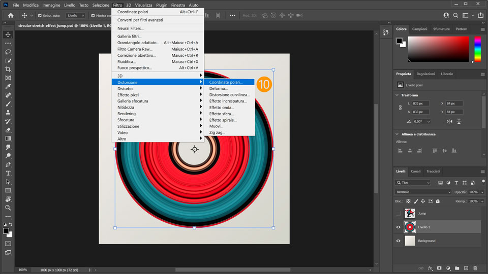 10. Dal menu principale, scegli Filtro > Distorsione > Coordinate polari per trasformare l’effetto di allungamento orizzontale in uno circolare.