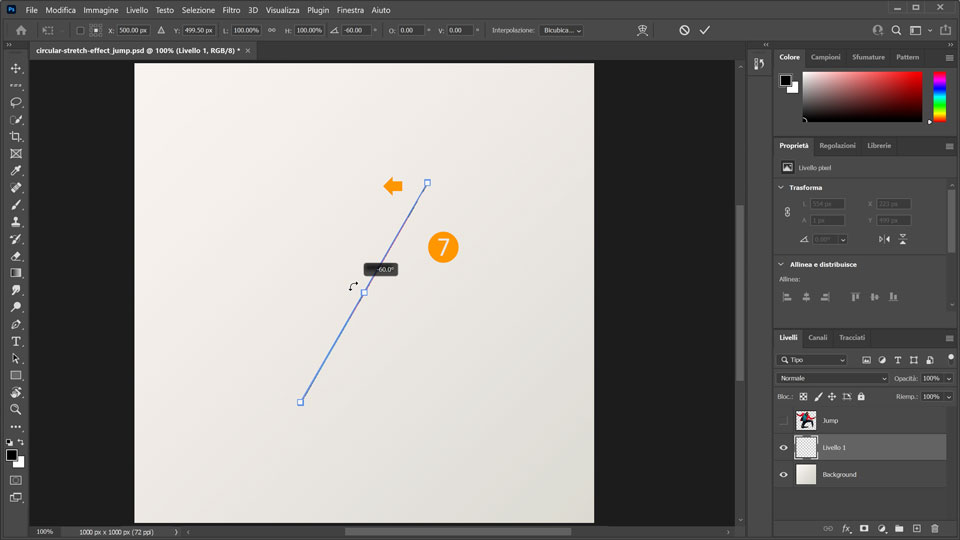 6. Per ruotare e allungare la linea dei colori, seleziona lo Strumento Sposta e spunta la casella Mostra controlli di trasformazione. Verranno visualizzate tre maniglie.