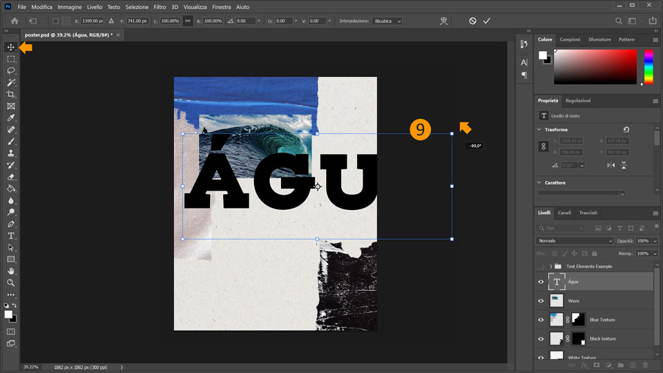 9. Fai clic sullo strumento Sposta (V) e porta il testo al centro del poster. Dopodiché, posiziona il mouse vicino all'angolo superiore destro del blocco di testo finché non si trasforma in un cursore a due frecce curve. Ora tieni premuto il tasto Maiusc e ruota il testo di 90 gradi.