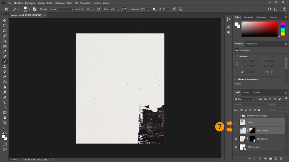 4. Seleziona lo strumento Sposta (V) e posiziona il rettangolo con la texture nera nell’angolo inferiore destro.