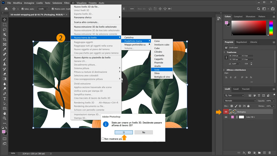 2. Seleziona il livello denominato "Packaging graphic" e vai su 3D > Nuova trama da livello > Predefinito trama > Soda per applicare la grafica del packaging a una lattina 3D. Photoshop ti chiederà se desideri passare all’area di lavoro 3D: fai clic su Sì per continuare.