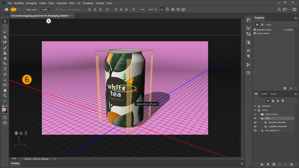 6. Ruota la lattina in modo che l’etichetta sia rivolta direttamente all’osservatore. Per eseguire questa operazione, fai clic sulla lattina per visualizzare l’asse 3D. Passa il mouse sull'indicatore rosso dell'asse y finché non viene visualizzato il cerchio giallo.