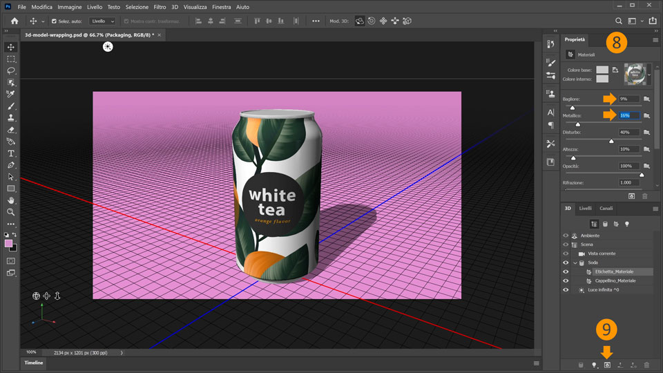 8. Per completare il modello, puoi regolare le impostazioni del materiale della lattina. Seleziona Etichetta_Materiale nella categoria Soda all’interno del pannello 3D e regola le Proprietà nel pannello corrispondente in alto. Imposta il Bagliore al 9% e il parametro Metallico al 16%.