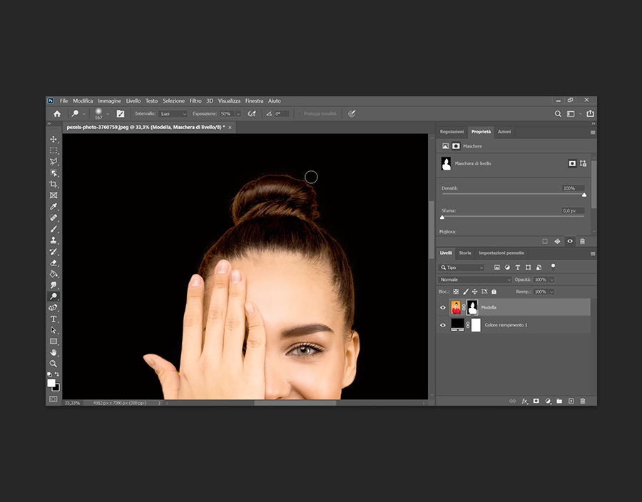 Lo strumento Seleziona e maschera avrà già fatto un ottimo lavoro, ma puoi ancora evidenziare altri dettagli che faranno la differenza, per esempio l’area attorno ai capelli. Seleziona la Maschera di livello, che dovrebbe assomigliare a una sagoma, nel pannello Livelli. Poi scegli lo strumento Scherma. Imposta il colore di primo piano su bianco e nella barra delle opzioni, imposta Intervallo su Luci ed Esposizione sul “50%”. Usa lo strumento per disegnare pennellate lungo i contorni del soggetto e rivelare dettagli che potrebbero essere sfuggiti alla selezione. Per aiutarti, fai clic sulla Maschera di livello tenendo premuto il tasto Opzione/Alt , così vedrai i dettagli che vengono evidenziati.