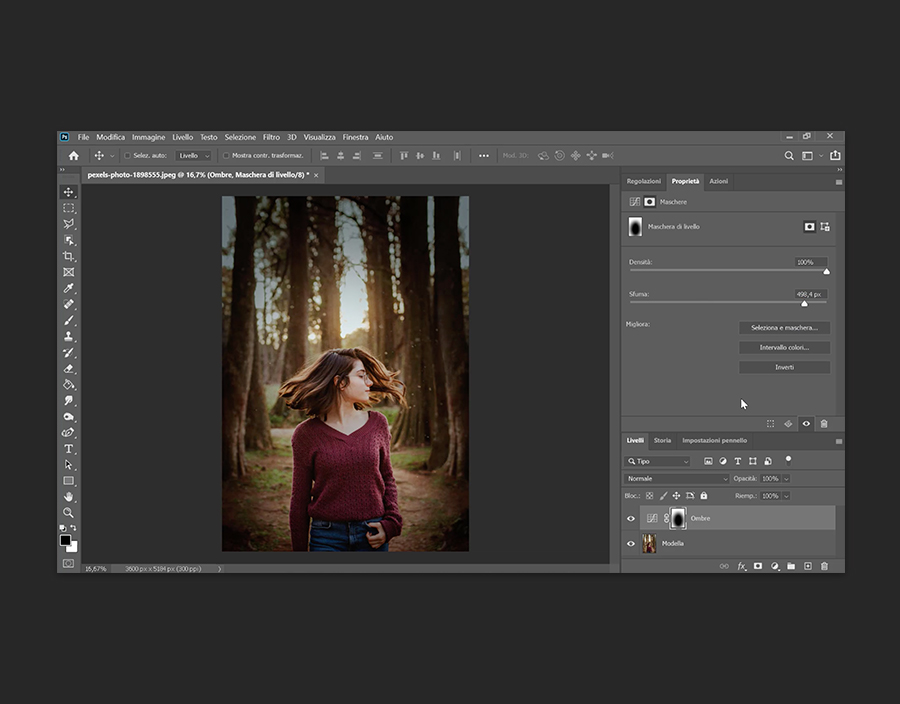 Ora puoi ammorbidire la finestra che hai creato per fare in modo che ricordi la luce di un riflettore. Fai clic sul livello Ombre, poi su Proprietà nel pannello Istogramma. Fai clic su Maschera, dove troverai la barra dei valori tonali. Imposta un valore superiore a “400” ed ecco fatto.
